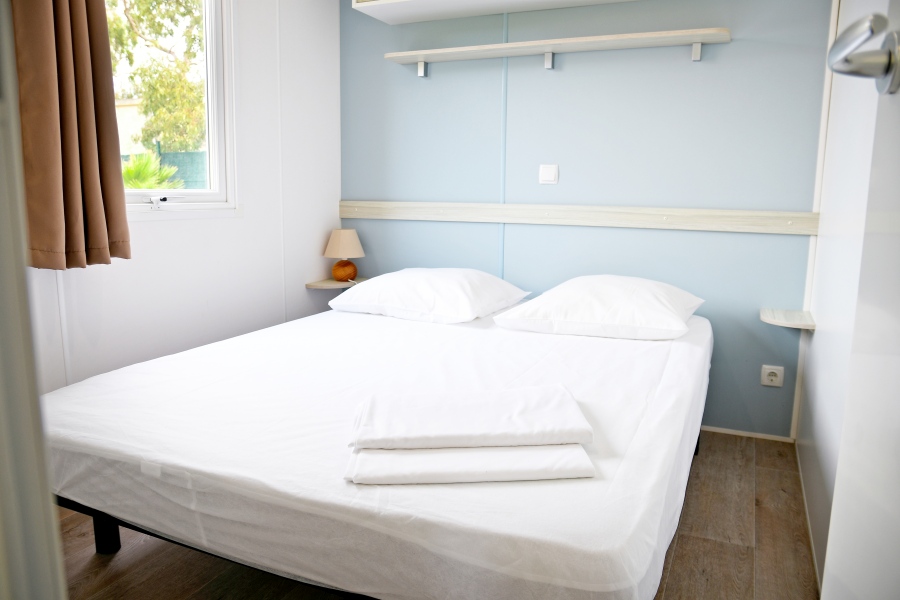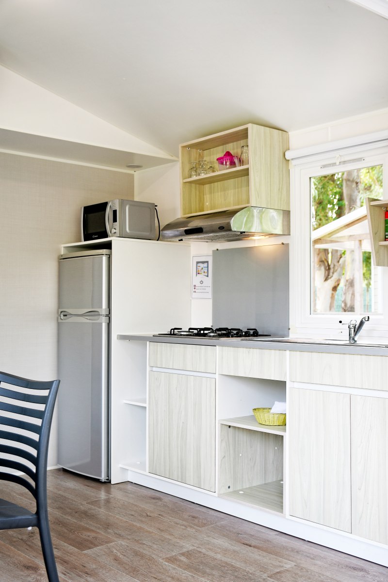 Mobile home de 33m² terrasse pignon, idéal pour 4 personnes, composé de quatre pièces :